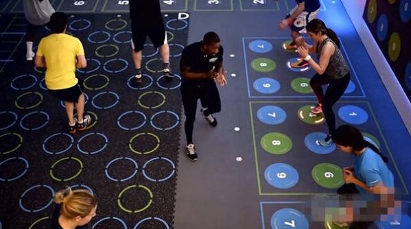 這個(gè)健身房的新穎之處在于,1800 平方英尺的面積內(nèi),墻面和地板上有很多數(shù)字、發(fā)光的燈圈,有點(diǎn)像是跳舞機(jī)和游戲場的設(shè)置。